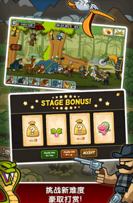 森林防御战猴子传奇破解版无限松果是一款充满趣味和挑战的策略塔防游戏。快速收集香蕉肯定是必须的,开局第一个首先造毒蛇,香蕉收集够了之后再出一只老虎,通过解锁和升级各种角色和技能,需要通过自己的机智打败可恶的砍树人,保卫野生家园,同时游戏对于一些新手玩家来说特别的友好,在游戏初期设置了完整清晰的教程关卡供玩家游玩,为了配合森林的主题,游戏画面也铺上一片一片的翠绿,小动物们虽然不是走纯萌路线,但是生动活泼的动态效果也值得一看,游戏的创意非常的丰富,在这里玩家可以使用各种各样的武器,进行闯关挑战。玩家也可以购买道具,帮助自己完成任务。