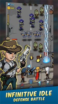 僵尸战争空闲防御破解版是一款结合了策略、塔防与空闲游戏元素的手游,2113年,僵尸启示录将人类带入了最可怕的灾难,一场巨大的僵尸战争,这场战争使人类变成了嗜血的僵尸,你需要将所有的僵尸通通都击杀,并建立一个强大的团队,例如僵尸军,僵尸杀手,僵尸seige,僵尸打击,僵尸防御者英雄……随着游戏的深入,玩家将解锁更多地图、武器和英雄,面对更加复杂多变的僵尸种类和强大的BOSS,体验一场场惊心动魄的生存之战,无论如何,您都可以赢得这场战略性的闲置防御射击TD游戏的最有韧性的队伍。