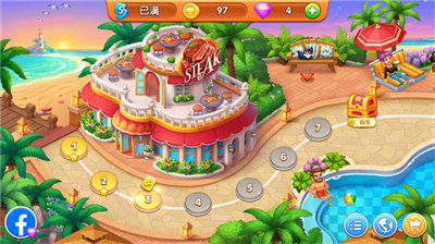 在海边沙滩的美景下收集食材,通过努力挑战几千个关卡,逐渐扩大自己的餐厅规模。