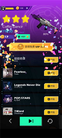 2、游戏会根据歌曲的不同给出一套独特的音符谱子,当音符出现的一瞬间你要快速反应过来,等到它们到达规定的区域就进行射击,这样就算是成功击打出节奏。