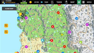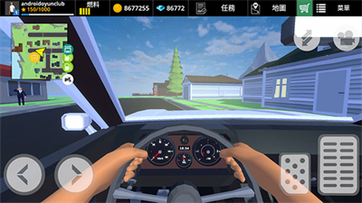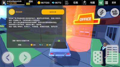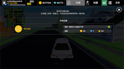 5、菜单栏上方分别为个人信息、汽车燃料、金币钻石、任务以及地图和商店,新手玩家可以先点击“任务”,根据提示完成任务,获得经验。