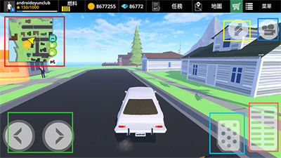 2、红色区域是地图,可以看到自己所在位置。绿色区域控制汽车方向,蓝色区域是刹车,粉红色区域是油门,控制前进。