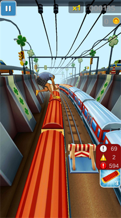 玩家们在游戏中不仅要收集金币,扑面而来的火车也会让你累够呛,在这个过程中你可以使用道具,加速道具能够让你快速前进,使用滑板可以帮助你多出一条生命,点击屏幕两次可以使用道具。