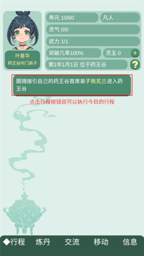 按时上课,做掌门长老相关的宗门任务可以涨长老/掌门好感和宗门贡献值。精力每天恢复一点。拜访长老交好概率会教给你丹方和给零花钱,好感40以上会提出收你为徒。拜师可以多一门课学炼丹和毒药,还可以组队抱大腿下地图探索采药,很有用。初期钱和贡献不够可以先到宗门兑换买第一张药林图后开刷,然后在宗门贡献卖药材。刷地图时sl出大佬入队带你探索下一层可以出更贵的材料。