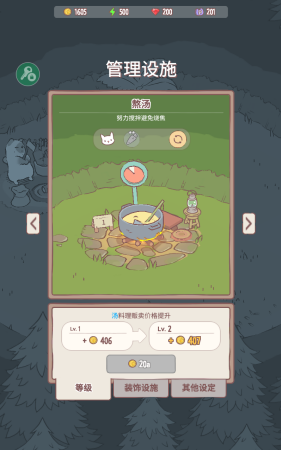 游戏中的经济体系设计得十分有趣,小猫咪们通过三种主要的设施来为我们赚取金币:煮汤点、果汁点和炒菜点。这些设施能够生产出多种美味的汤品、果汁和炒菜,而这些商品的销售则是我们获取金币的主要方式。因此在游戏初期,我建议玩家们应当优先考虑使用手头的金币对这些设施进行升级,这样可以显著提高商品的价格,从而带来更高的利润。