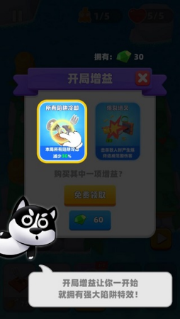 之后玩家可通过不断的挑战地图来解锁新的陷阱,解锁后的陷阱可以在关卡挑战中进行上阵,接着在游戏开局之前,可以选择开局增益来获得强大的陷阱特效!
