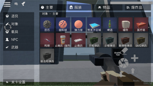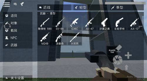4、点击右边“手枪”按钮拿枪,可以让角色切换到持枪状态,中心用于开枪,+号可以新增靶子角色。