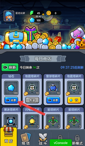 1、开局先进入商店界面,点击“免费”按钮领取每日钻石奖励,再点击确定完成资源获取用于后续建设。