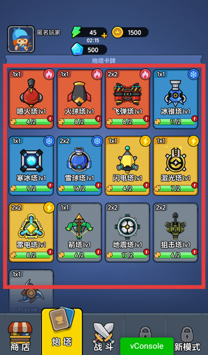 4、点击炮塔按钮,进入炮塔卡牌界面,可查看和使用多种炮塔卡牌如喷火塔、火球塔等,布置防御。