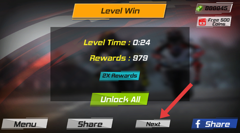 4、成功通关后会出现LevelWin提示,查看奖励内容并点击Next按钮进入下一关卡继续挑战。