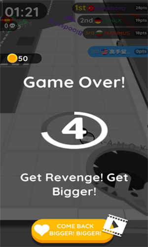 3、如果没有成功躲避,则会被其他黑洞吞噬。