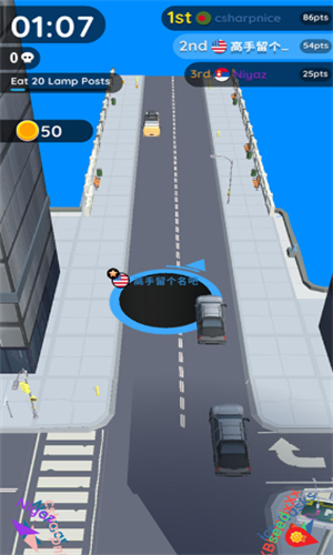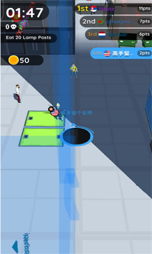 5、在游戏刚开始的时候,我们可以选择小一点的目标进行吞噬,例如人、垃圾桶、下水道井盖等小物品。