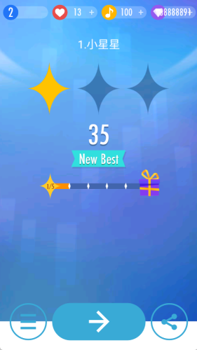 4、歌曲最后结束后会评级,分为1至3颗星星和1至3颗皇冠,三个皇冠的得分最高,也最难达到。