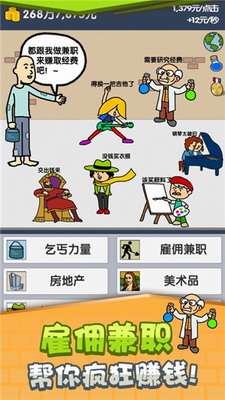 养乞丐2破解版无限金币药水版是一款魔性的休闲养成类手游,在这款游戏中你将扮演街头乞讨的乞丐,拓展无限魔性的挣钱方式,享受不劳而获的快乐,雇佣街头艺术家们,用财富实现他们的艺术梦想,解锁专属沙雕剧情。该游戏玩法模式比较新颖,由于本身采用的放置玩法,因此在基础的点击赚钱基础上,你只需狂点屏幕即可,但为了提升该游戏的内容体验,玩家可以利用赏金来雇佣学生、大妈或者上班族等其他社会群体来帮助你一起赚钱,为了能够将赚取的财富有效利用,这里还增加有各种各样的投资项目,置办各种家产、收购各种强大企业,或者点击购买其他国家,这些你都可以在这里得到实现。玩家可以非常轻松的体验游戏,雇佣街头艺术家们,用财富实现他们的艺术梦想,雇佣学生、大妈或者上班族等其他社会群体来一起赚钱,解锁专属沙雕剧情,享受不劳而获的快乐。等到了乞丐的钱越来越多后,玩家还可以置办各种家产、收购各种强大企业,或者点击购买其他国家,非常搞笑。
