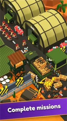 1、创新军事主题与放置玩法结合,玩家轻松点击升级,自动化生产军事装备;