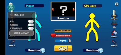 2、选择好模式和人数后,进入对局准备界面,在这玩家可以给火柴人换装备,以及皮肤等等,准备好后点击go就能进入游戏