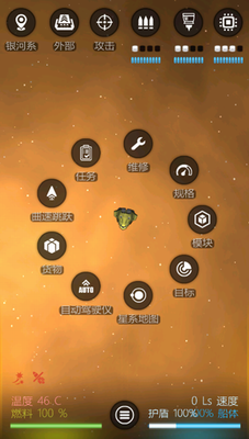 3、战斗在有敌人的情况下,左上角 星系 下面会出现敌人的信息和血量,点击,然后开启武器,选auto就能缠斗,不选auto可以手动转向打右上角可以调节电力分配,提高子弹可以加攻速,提高引擎可以提高转向与加速度,提高芯片可以增加回盾速度,同时都可以提高对应模块的回蓝左上角外置设备可以选择箔条发射器,在10秒内敌人无法对你开火(战斗必备,在auto中最好操作了,一直点开启就行,就算你不用你的敌人也会用)开启导弹防御可以拦截24枚导弹(用处不大不装)还有 护盾电池 消耗回盾的蓝条补充盾,同时飞船热到爆(战斗中盾没了回盾的蓝也耗完了,用不了,战斗外,慢慢回盾就行,比较鸡肋,不装)在恒星周围战斗还要开启 散热片发射器 不然飞船热到爆(探索必备,闪电也会造成过热)开启武器的时候,右边的黄条就是你武器的子弹量(激光是无限子弹),要在太空站 维护 补给 进行补充。武器推荐用 加农炮 集束激光 散弹加农炮,脉冲激光耗电大,伤害不行,不如加农炮导弹贵,伤害较高射程最远,但发射慢,会被拦截采矿激光根本就没伤害集束激光,打盾快散弹加农炮伤害最高,但射程近弹药少,不过贴脸往往一发入魂,而加农炮本身打船体就有加成推荐配一两个高级集束激光,剩下的全配散弹加农炮,这样效益最大对于护盾当然是越贵越好,防御等级高嘛!