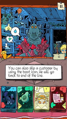 1、在游戏中,玩家将使用卡牌帮助商家创造新的商品,提高商店的人气,吸引顾客。玩法非常新颖多样。