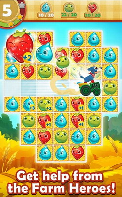 农场英雄传奇游戏不计时,只计算消除水果蔬菜的步数,要求玩家在规定的步数内尽可能消除目标果菜。成功消除三个或以上的果菜后,会有额外奖励,有点类似连连看。