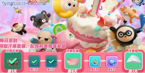 2、即日起至7月6日,蛋仔们只需每日签到 即可领取潮流纤维、表情【惬意】、动作【蒸桑拿】、汗蒸套装和细框眼镜等丰厚奖励。