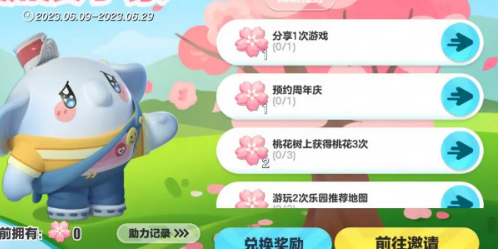 4、蛋仔们完成任务或邀请好友助力就可用桃花币兑换【流浪小象哆哆】等诸多好礼,送出桃花解锁流浪小象全部故事还可领取专属小象动作“颤巍巍”。