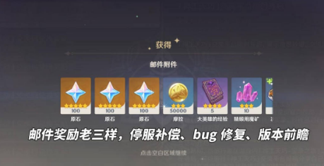 3.9/4.0版本前瞻(咱也不知道下一个到底是啥),300原石;往期bug统一修复,300原石;3.8版本更新停服补偿,300原石。