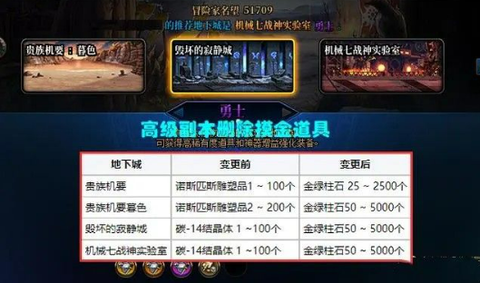 (1)所有高级副本的摸金道具全部删除,如贵族机要的“雕塑品”、寂静城和机械战神的“碳14”,全部改成了金绿柱石,再加上金绿柱石本身的疯狂降价,基本上可以确认,高级副本收益四舍五入就等于0了!