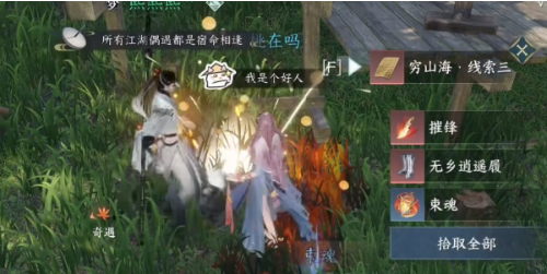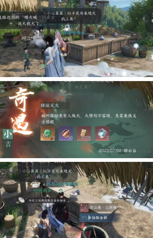 1、首先我们需要来到杭州-磁州驿站(429,991)这个位置,我们来到驿站之后会触发奇遇任务我们进行灭火,灭火之后我们就可以捡起武器穷山海;