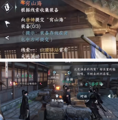 2、我们捡起穷山海之后就会获得线索,我们需要返回到汴京找到铁匠-唐铸,进行对话之后我们就需要开始收集材料了;