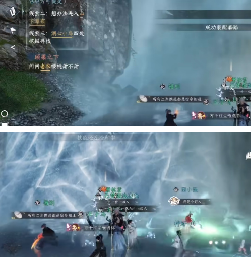 3、根据线索我们需要来到瀑布旁边,我们使用寒冰掌进行破水,之后我们就可以进入瀑布下面打开宝箱;