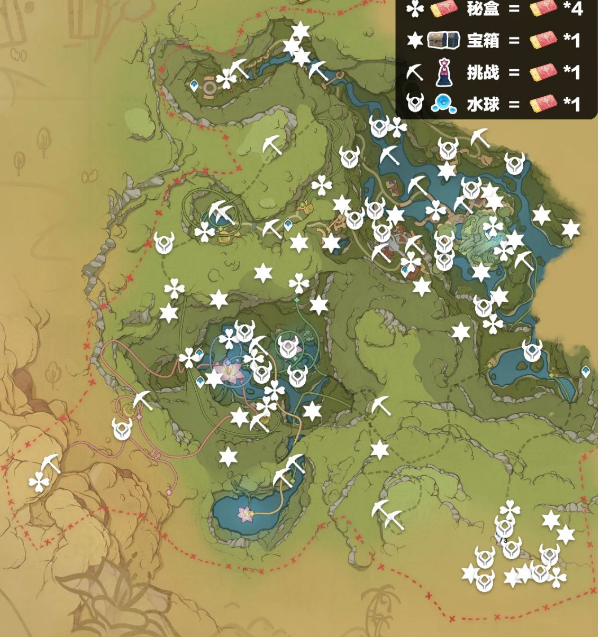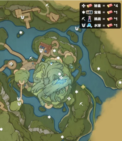 四叶草=密盒(礼券*4)、六芒星=宝箱(礼券*1)、稿子=挑战(礼券*1)、敌人=水泡(礼券*1)
