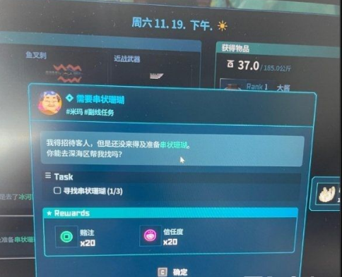 1、需要串状珊瑚这个任务是餐馆任务,由米玛发布的支线任务,需要前往深海找。