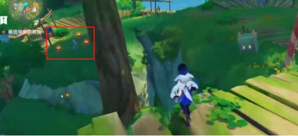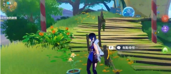 3、第二个水灵在下面,我们顺着木桥下来,在路边有一朵有花盆的甜甜花,靠近后选择“有点奇怪”即可找到第二只水灵;
