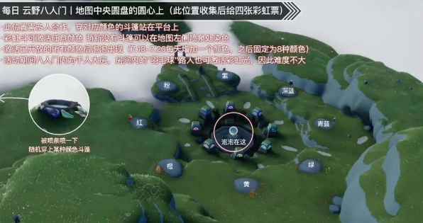 2、泡泡出现的位置如下图所示,地图中央的大泡泡是固定出现的,需要多人合作穿着对应颜色的斗篷站在平台上激活彩虹才能获取,大泡泡收集可以获得4张彩虹票;