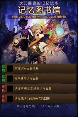 第三劳动节新副本次元回廊的配套活动,这个副本被整整脱了一个多月,原本3月就该上线,硬生生拖到了五一劳动节版本,策划诚意劝退玩家。配套活动是记忆图书馆,因为这个是魔法师主题副本。基本上就是送团本贴膜的材料,加速玩家毕业的。