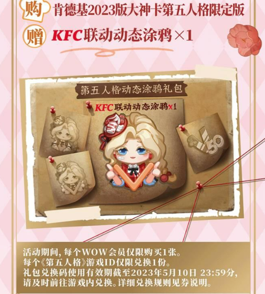 九、开通【肯德基2023版大神卡第五人格限定版(90天)】后,可在“第五人格”微信公众号或《第五人格》游戏内兑换“第五人格动态涂鸦礼包”1份。用户可于2023年5月10日23:59之前前往大神卡主题页【专享福利】权益池查看对应权益,点击“立即领取”可前往WOW会员卡包查看“第五人格动态涂鸦礼包”兑换券1张。兑换券使用有效期截至2023年5月10日23:59。在使用有效期内,关注“第五人格”微信公众号,点击底部菜单【事务所】后选择【许愿兑换】即可进入兑换页面,按页面提示使用兑换码兑换礼包;或登录《第五人格》游戏,进入许愿单页面,按页面提示使用兑换码兑换礼包。活动期间,每个《第五人格》游戏ID仅限兑换1份“第五人格动态涂鸦礼包”。“第五人格动态涂鸦礼包”权益由《第五人格》游戏提供,权益具体内容说明及使用规则以游戏平台官方公示为准。