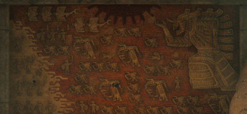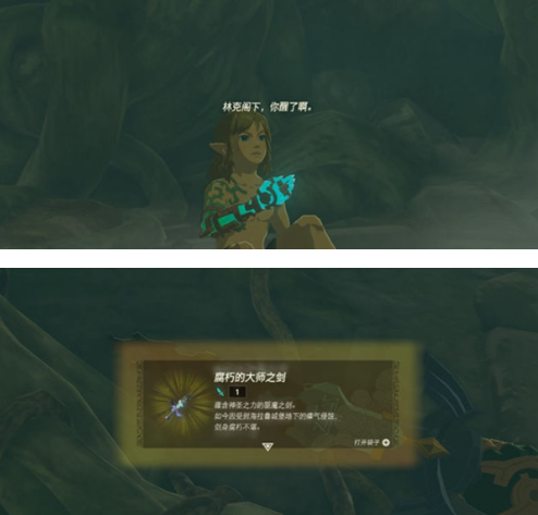 5、在深处会看到怪物,挥剑击杀触发剧情,这里有块石壁,记录着当年封印战争的全貌,我们听着塞尔达叙说石壁上的事迹,之后再继续往下面走。