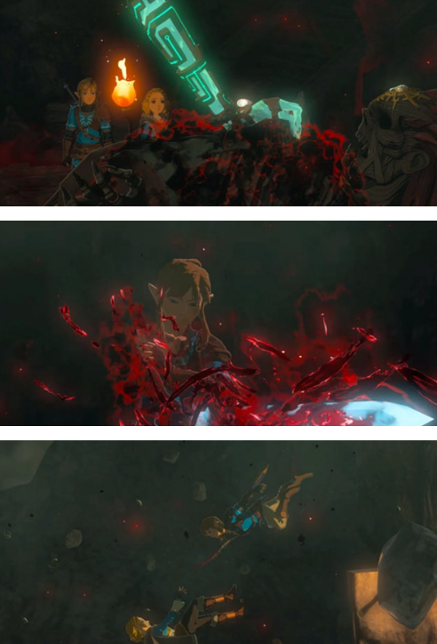 6、在下面终于见到了宣传片那个骷髅头了,之后触发剧情,骷髅头利用瘴气要袭击塞尔达,被林克挡住了,还把满血的林克吸收掉成3颗血了,时候发生的一切就按照剧情那样,城堡飞天,林克救不到塞尔达,期间他的右手臂还被腐蚀了,拥有了新的能力。