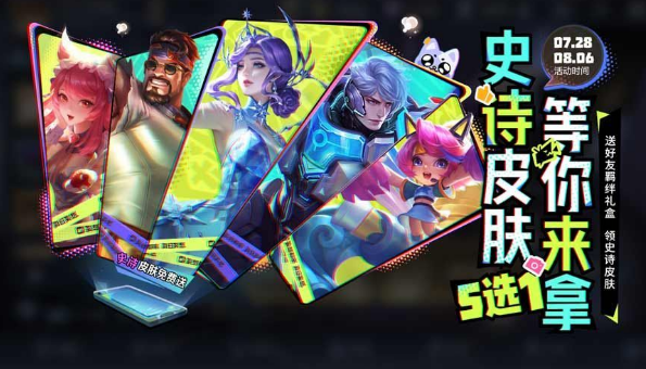 本次可以免费领取史诗皮肤的活动叫做「羁绊之旅、峡谷再续」,该活动7月28日上线,8月6日结束,完成任务后,玩家可以获得一个史诗皮肤自选宝箱,在这个宝箱内有5个免费得史诗皮肤任选,他们分别是: