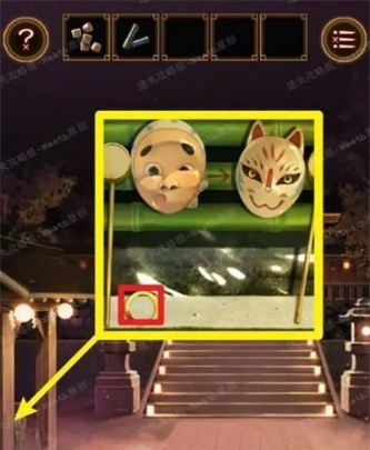 2.向左移动,点击小亭子,观察面具和指示箭头,拿走下面的发光手环。