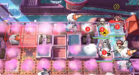 随后如图所示继续部署山(技能好了就开)→ 艾雅法拉(向左)→ 三号位置放个汽水瓶 → 塞雷亚。