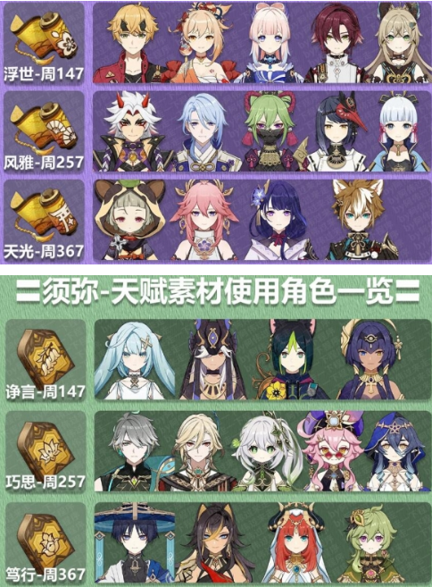 ◆角色天赋升级需要三种素材:天赋书、普怪掉落物、以及6级以上天赋会用到的周本掉落素材(皇冠为升满级需要)。