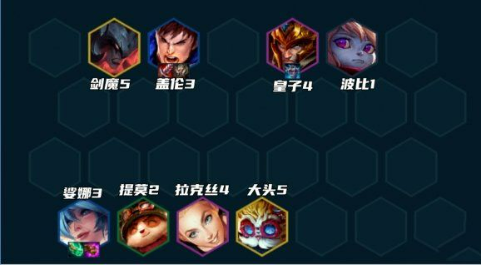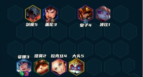 无转职情况下,同样拉7再D牌。7人口找2星盖伦+皇子+拉克丝,开5德玛+3约德尔羁绊,然后卡50利息上8人口。