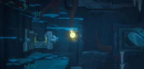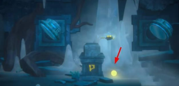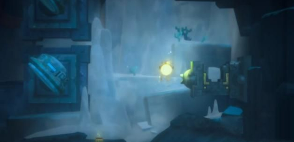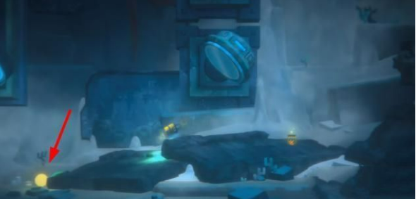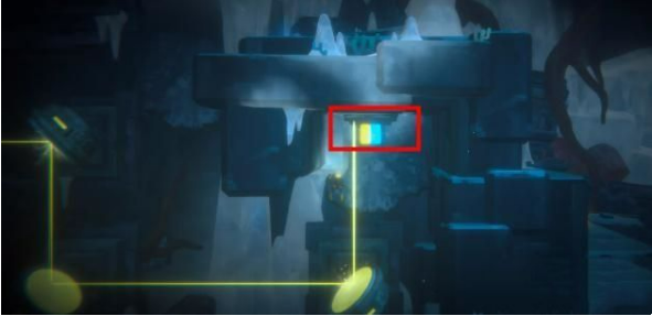 6、继续往里走,解锁完冰河通道壁画后再往下游,到达第二处光线折射挑战,找到下图的光球放置到装置上。