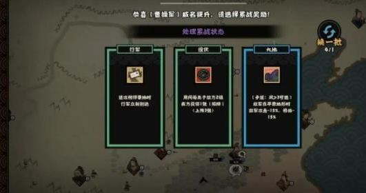 军团打下要地后,会获得威名经验,用来提升威名等级提升,就可以获得更多增益。同时,如果对于当前的增益效果不满,可以消耗军团用间等级,利用右上角的刷新功能进行刷新。
