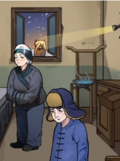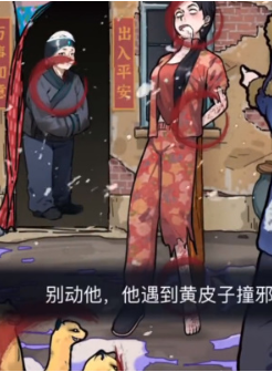 1、进入游戏中我们要找出图中的不对劲地方;分别是神志不清的人,反绑的手,严重的外伤,地上的黄皮子,拉开门帘可以发现大壮的母亲。