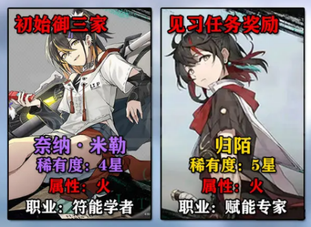 奈纳、归陌,御三家+见习任务奖励,依旧是每位玩家都能拿到的角色,火系有着对单优势,打Boss更省时,同样的,剩下的两个位置拿来补属性加成或保证生存;