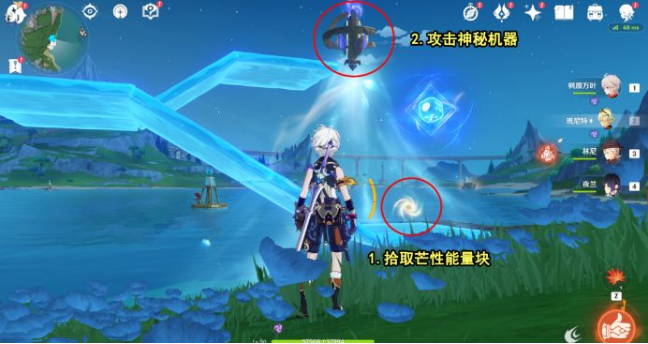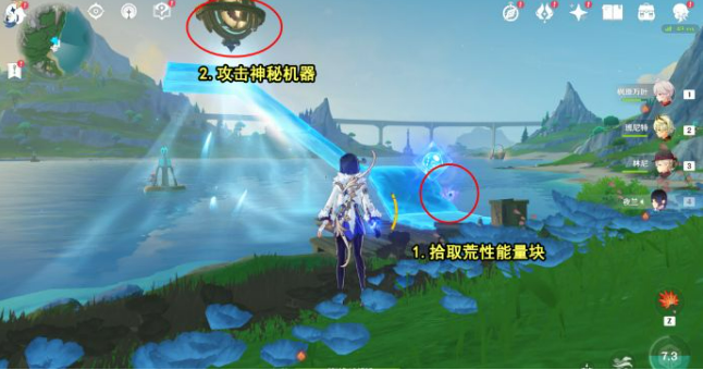 2、到达之后拾取荒性能量块攻击神秘机器并将出现的敌人消灭掉;