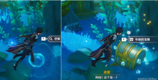 2、我们来到水族馆外与膨膨兽对话,对话结束后返回水族馆内部根据指示看见一个点击挖掘可以获得一个华丽的宝箱。