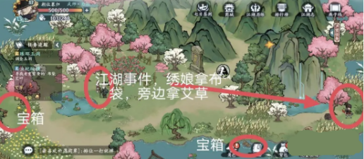 6、宝箱9、宝箱10位置,江湖事件绣娘拿布袋,旁边拿艾草